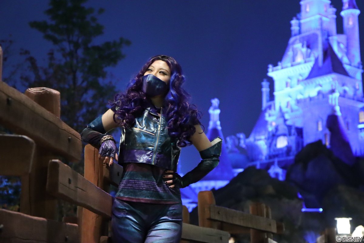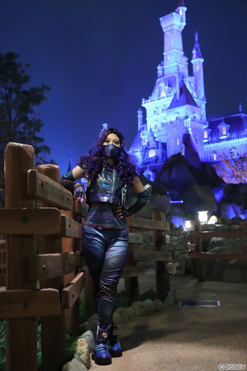 夜は3の島服マル仮装でした😈🐉💜 夜のオラドン城ならぬ 美女と野獣のお城を背景に マルちゃんの仮装で写真を撮るのが夢だったのだけど実現してうれしい… My Once Upon a Timeが大好きなので雰囲気だけでも寄せられて幸せだったな #ディセンダント #Dハロ仮装 #Dハロ仮装2021