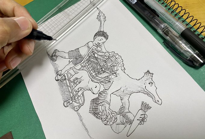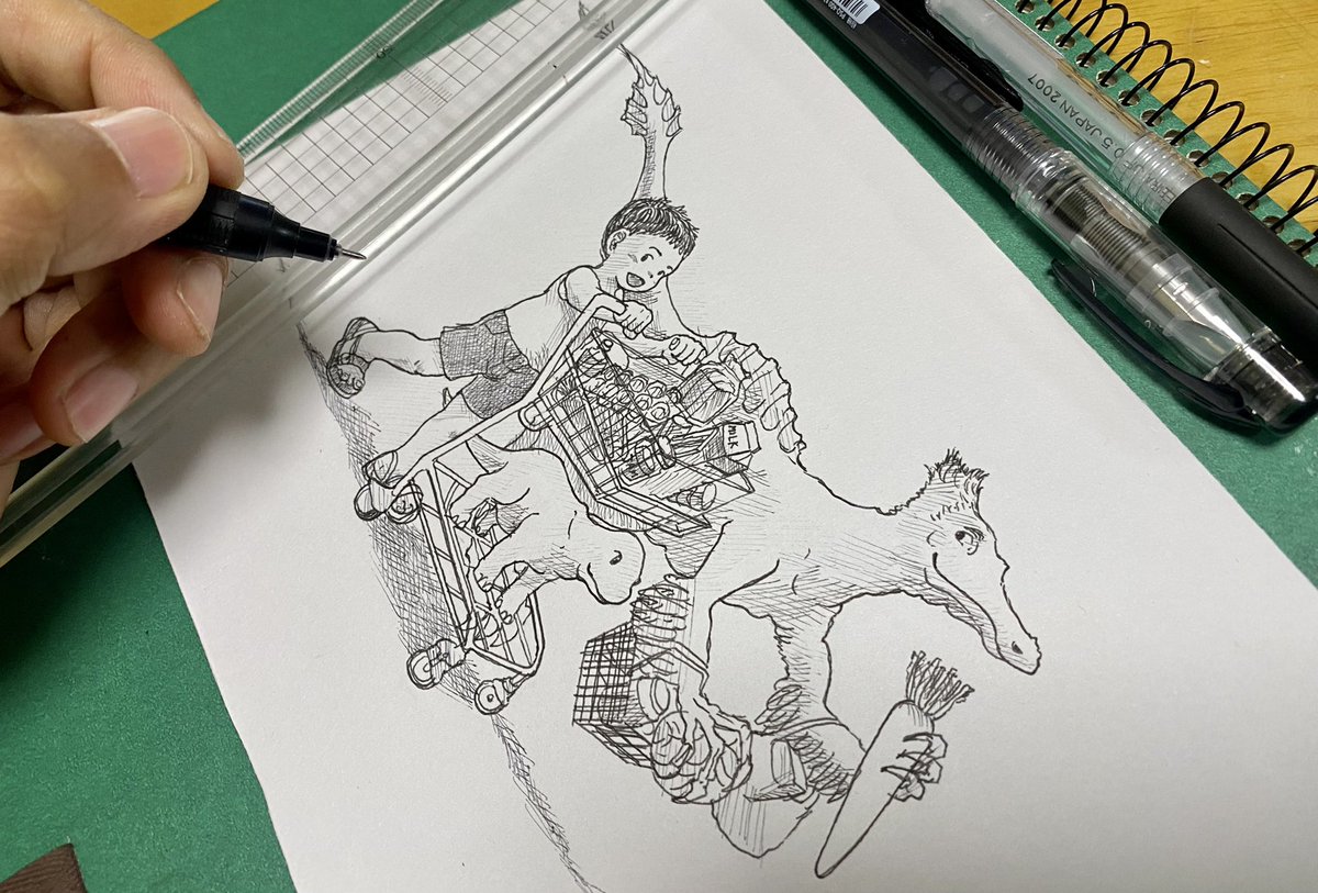 ディノケイルスとお買い物 ゴールデンウィークの思い出は、 以外にも、家族でどこかに出かけたとかじゃなく、子供たちと近所のスーパーに買い物に行って、ワイワイ好きなものを買ったことだった。 幸せは身近にある。 #inkpendrawing #お絵描き #買い物 #drawing #Deinocheirus #ディノケイルス