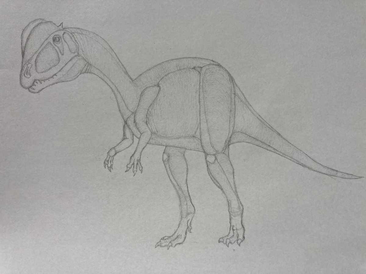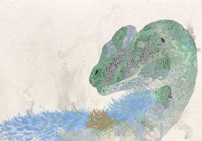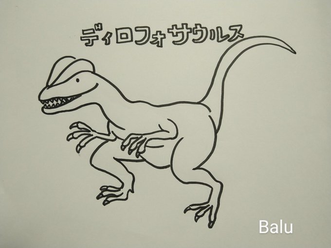 『恐竜塗り絵』 #ディロフォサウルス 頭に2枚のトサカがあります。 エリマキトカゲの様になる、のかな? 夏休みに入って何故か片付けブーム✨あちこち整理整頓しています🤩 #イラスト #絵描きさんと繋がたい #恐竜 #アトリク