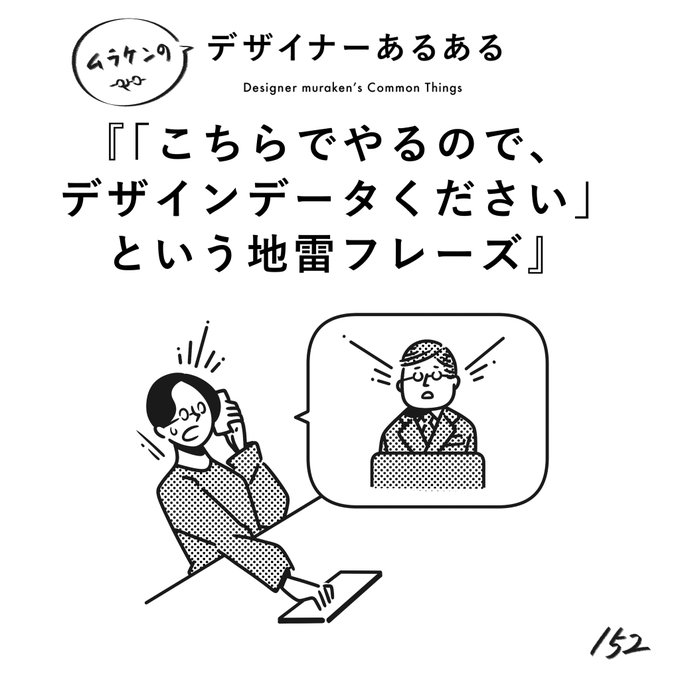 【152.「こちらでやるので、デザインデータください」の地雷フレーズ】 #デザイナーあるある フォントはあるのかしら?視認性と情報構造のバランスは担保できるかしら?色のトーンは…(etc (※ムラケンの私見です) #デザイン漫画 #デザイナーあるある募集中 #デザイン