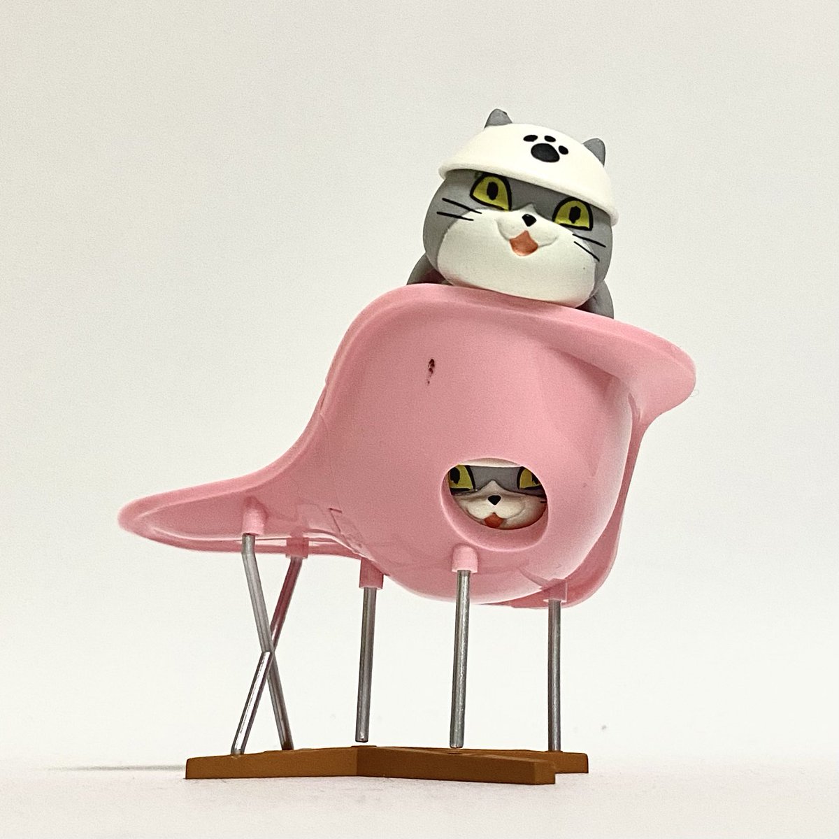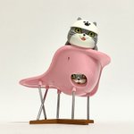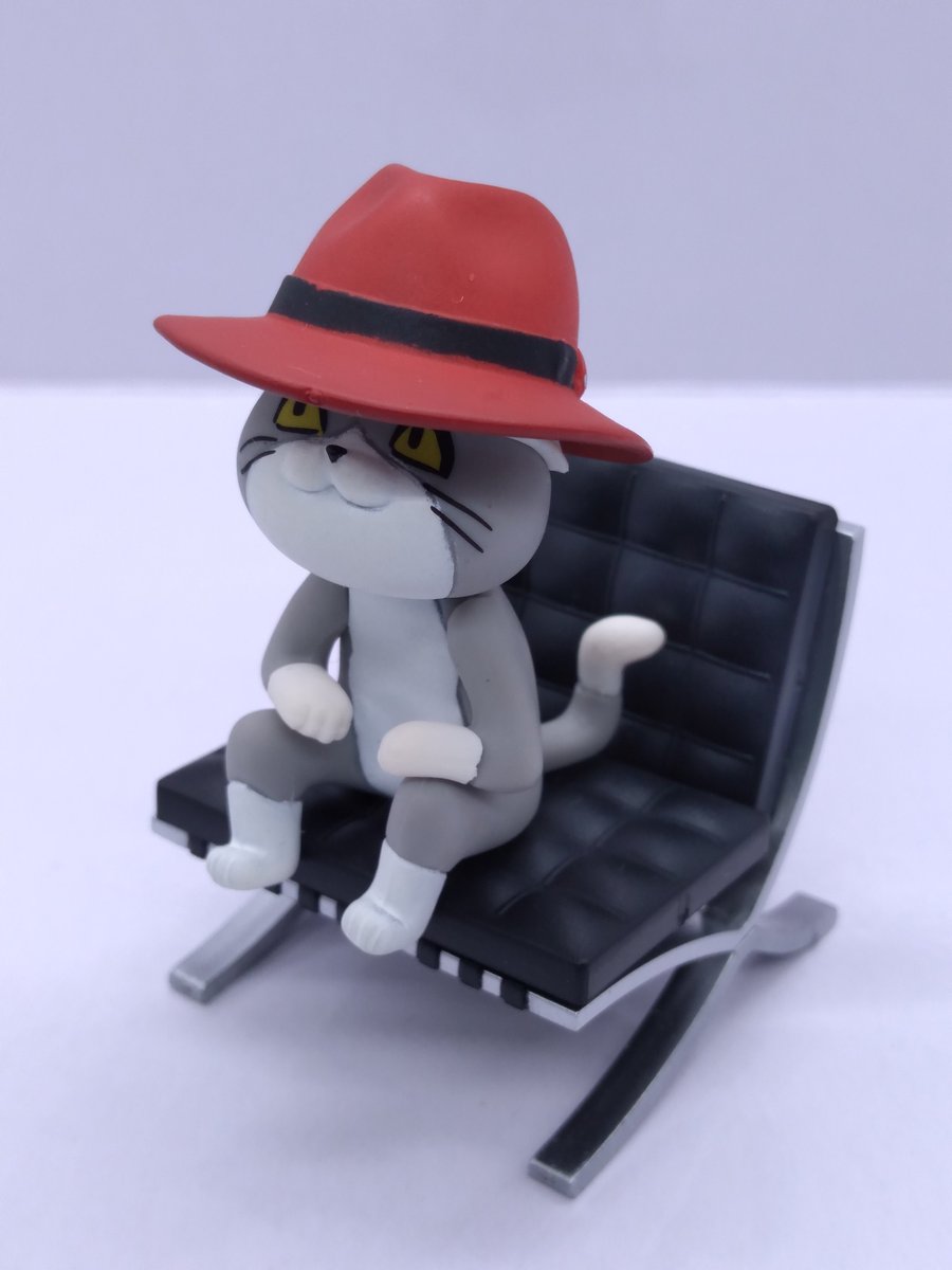 おしゃれな椅子とソフトハットを 手に入れた猫さん🐱 とってもダンディーに変身💕 なのに #チャッキー だと チロリアンハットにしか見えないのどうして…😂 #ガチャガチャ #仕事猫 #オモ写 #デザイナーズチェアコレクション #マキシンミニチュアコレクション