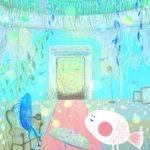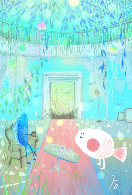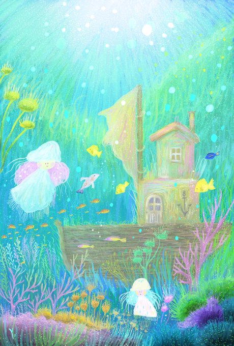 #デザインフェスタギャラリー原宿 にてポストカード展⚘⠜ 展示販売してますよ〜ꕤ 珍しくデジタル絵で参加しております(*´ `) 浮いてる子達はクラゲちゃんです⚘ 沈んだ船を遊び場にしていますꕤ #イラスト #絵
