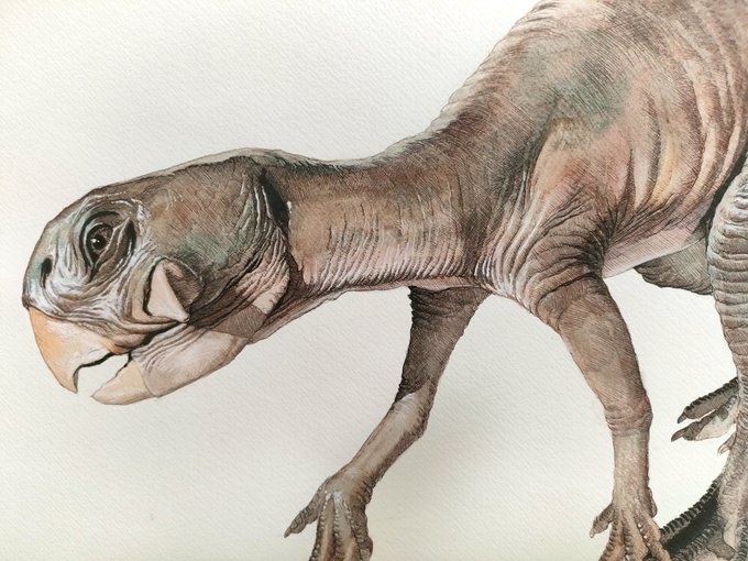 プシッタコサウルス。ギリシャ語でオウムトカゲの意で、その名の通り嘴があります。 これも少部数だけポストカードにして出したかったのですがスペースの都合で次回に。 #恐竜 #プシッタコサウルス #水彩画 #デザインフェスタ57