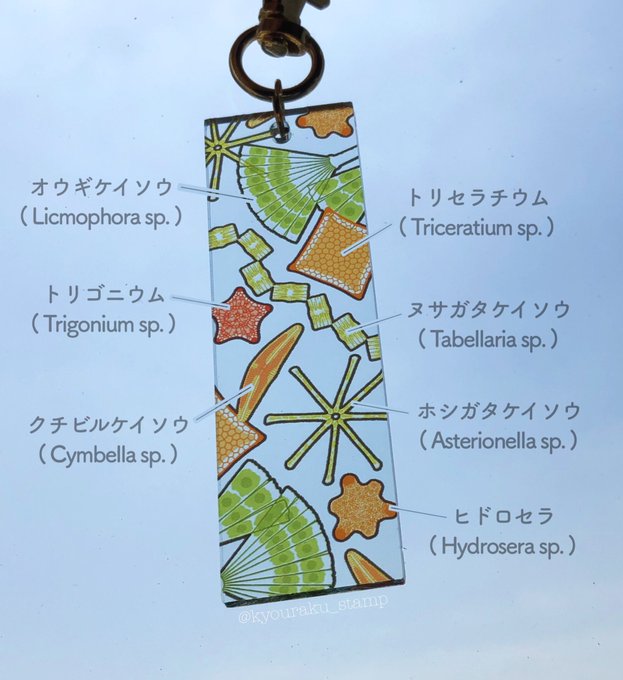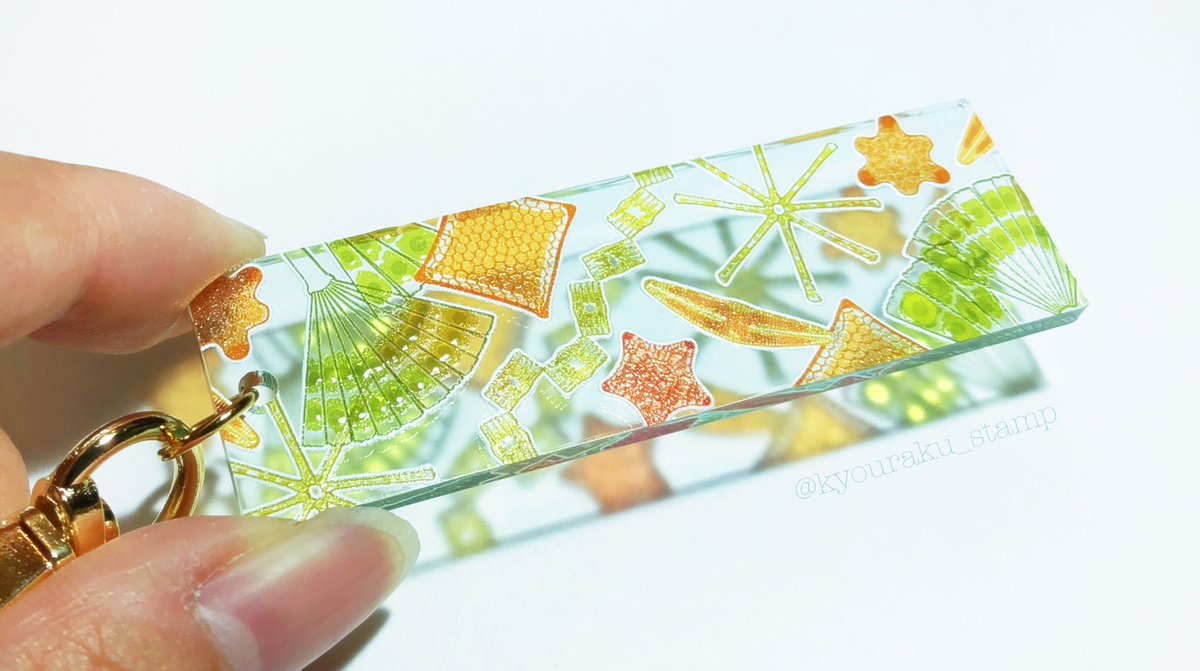 【新作グッズ】 ⚫︎シアノバクテリア ⚫︎紅藻 ⚫︎ミジンコ ⚫︎珪藻 ◀︎🆕🦠 プレパラートをイメージしたアクリルキーホルダー、待望の新作です‼️‼️‼️✨ 光を当てた時の影はオウギケイソウの細胞質と角が光って見えます🔬 #デザフェス57 #デザインフェスタ57