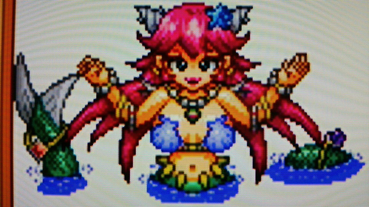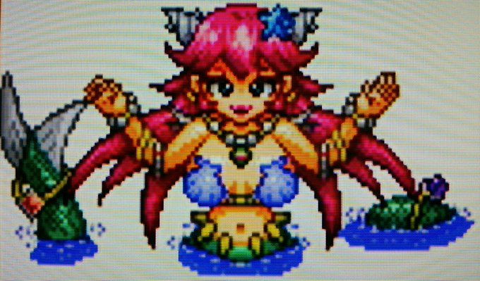 #ハーティーパイロッツ ボス2人目。 高飛車な人魚のお姉さんです。 どこかで見たような攻撃をするとかしないとか!? 2段階目は…まさか取れちゃうの!? #デザエモン #シューティングゲーム #STG #ドット絵 #pixelart