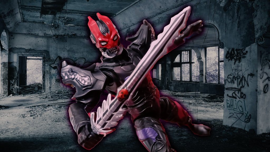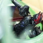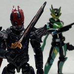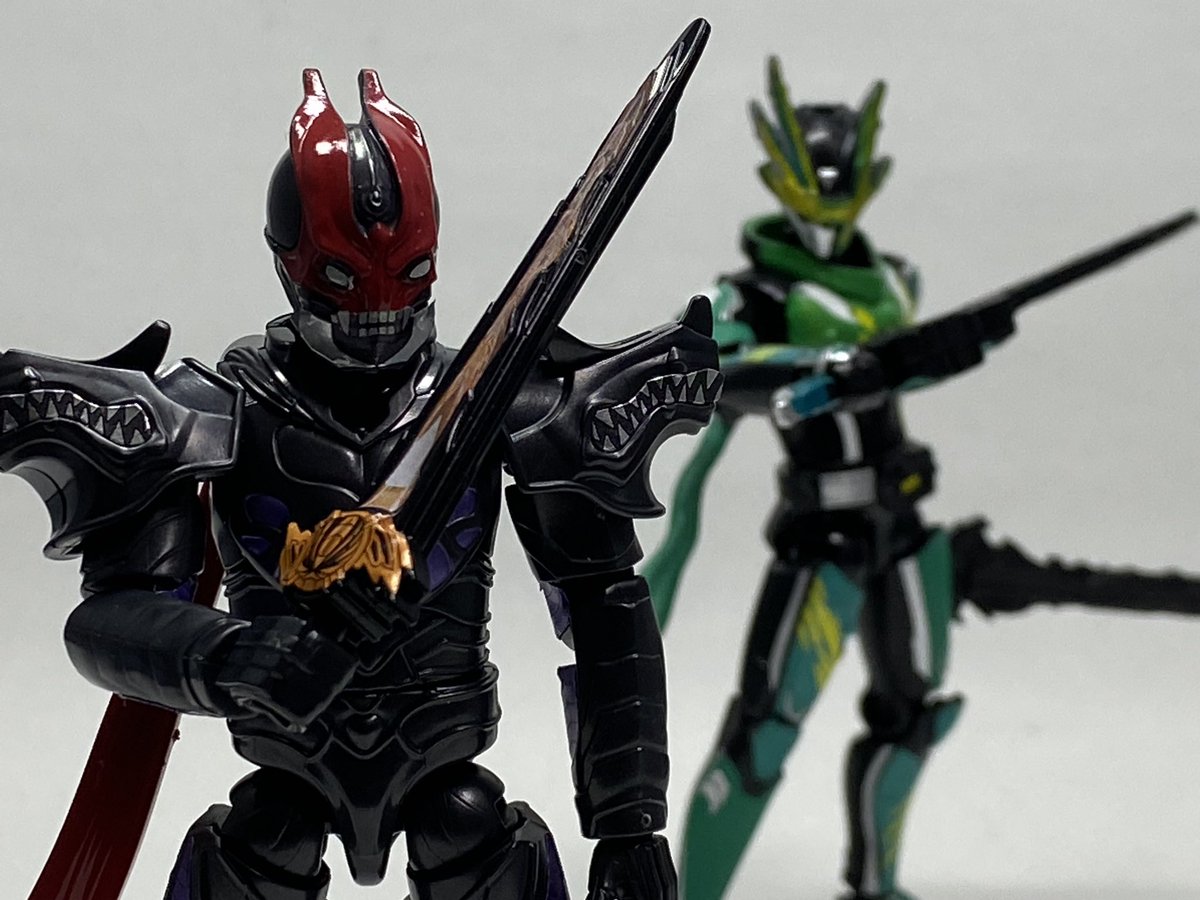 #夜のフィギュア撮影会 お題「敵対」 敵対と言う名の共闘!! 緋道(アカミチ)とデザスト‥文句を言い合っていても、あんがい仲が良いのカモしれない! #仮面ライダーセイバー #仮面ライダー剣斬 #デザスト #装動 #食玩