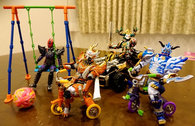 「この公園は我々が占拠した!」 メギドたち、謎のやる気が出て全面塗装してしまった。 ライダーたちも全面まではしてないというのに。。 この後、3歳息子がデザストだけ持っていって剣斬の隣に並べてた。 #装動 #仮面ライダーセイバー #デザスト ストリウス レジエル ズオス #フィギュア撮影友の会