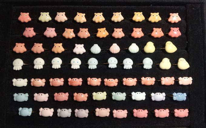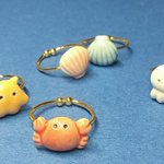 【デザフェス57 販売作品14】 ◆カニリング ◆メンダコリング ◆くらげリング ◆貝殻リング ◆ひよこリング🆕 →陶器の指輪🦀 金具はゴールドとシルバーの2色、調整可能なフリーサイズリングとなっております💍 #デザフェス57 #デザフェスお品書き