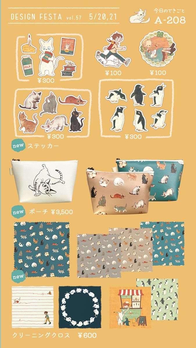 デザフェスお品書き✍ ステッカーとポーチ、それからクリーニングクロスは猫ちゃん柄が新作です。 ブース「A-208」でお待ちしてます。 2日間よろしくお願いします~! #デザフェス57 #デザフェスお品書き