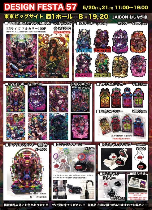 デザインフェスタのお品書きです!! 日時:5/20(土)/21(日) 11:00〜19:00 ブース番号:K-268 基本的に土曜日から全ての在庫を先着で販売予定です。 皆さんにお会い出来るのを楽しみにしております!! #デザフェス57 #デザフェスお品書き