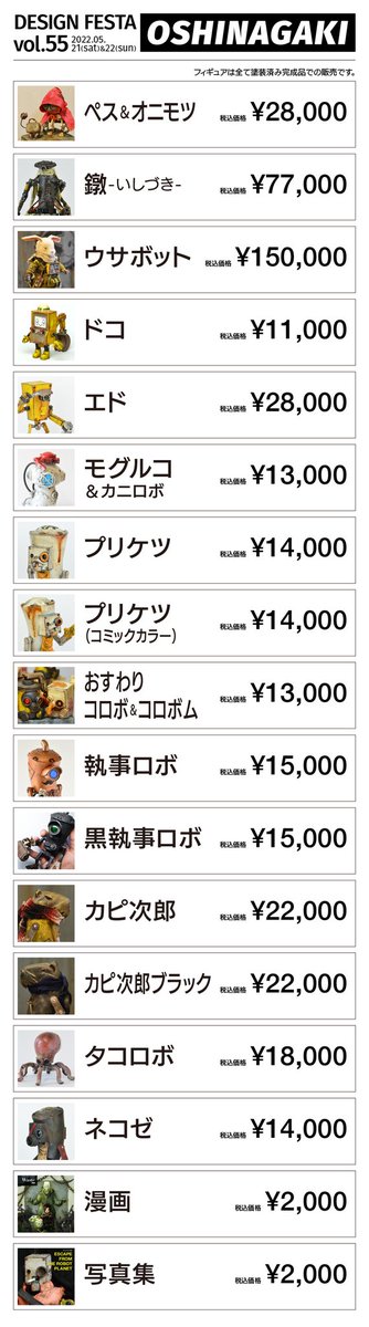 5月21日22日両日出展いたします、 デザインフェスタ55のお品書きになります。 今回久々のイベントなので気合がスゴいです。いつもの展示ブースがすし詰めになりそうです #デザフェス #デザフェス55お品書き