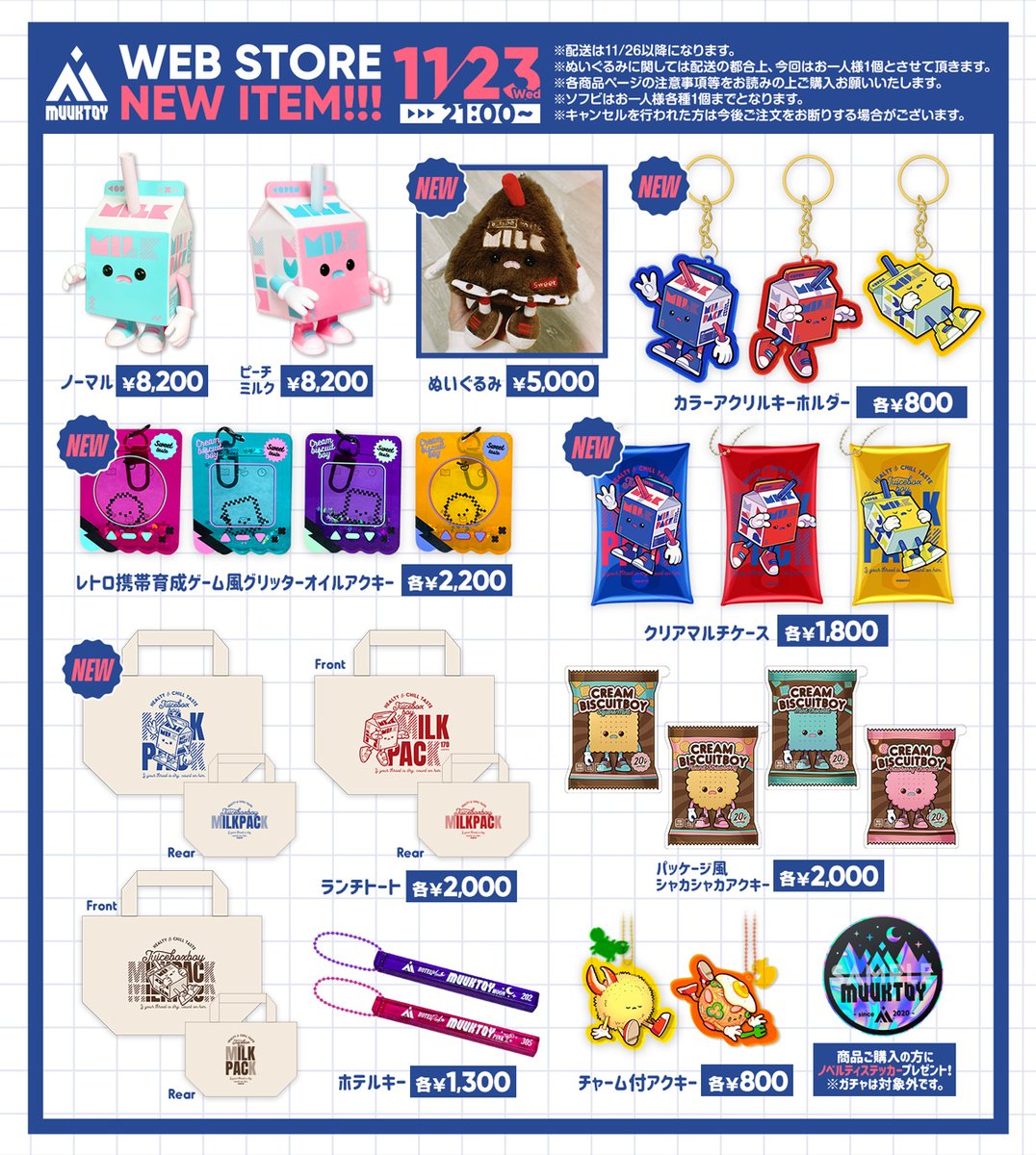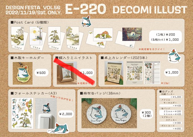 📢通販のお知らせ📢 【期間】11月30日(水)20:00頃〜12月14日(水)20:00頃 #デザフェス56 の新作含む通販開催🎉 木製バッジはお試し版につき今回の絵柄での再生産予定はなしです🙇♂️ ラインナップは画像をご参照ください!❌印は在庫なしor通販取扱なしです! 会場はこちら👇 icanfllllly.booth.pm