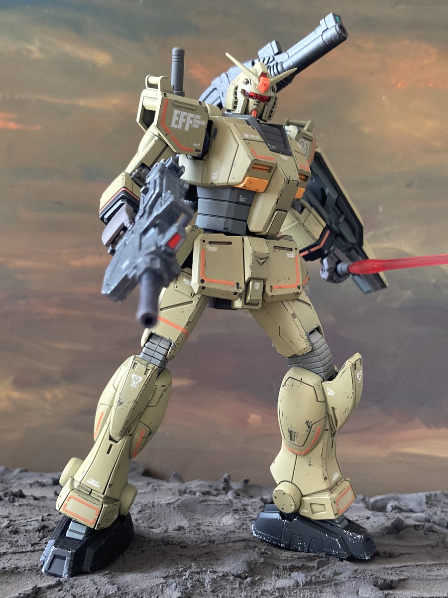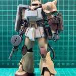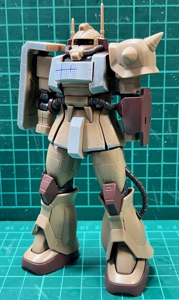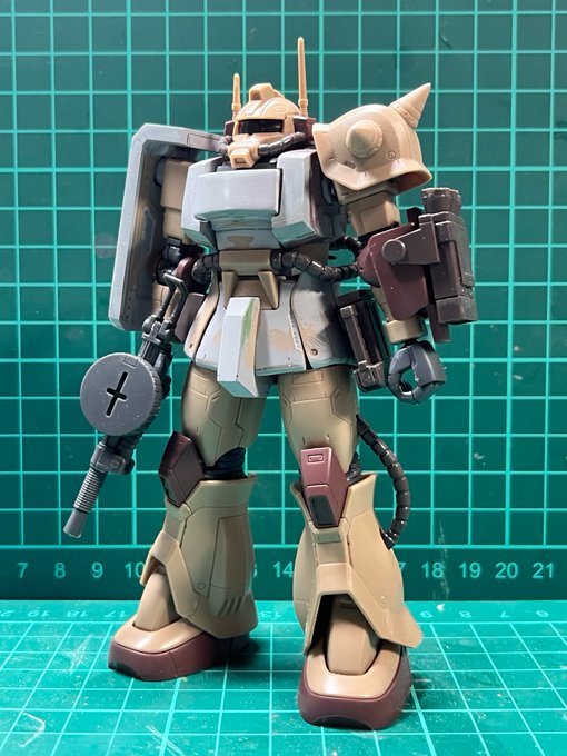#白背景でも撮ってみた カラーレシピは引用元に😭 両肩をスパイク化、寄せ集めパーツで左前腕にショートバレルガトリング😭 缶スプレー×マスキングシートによるスプリッター迷彩・・・実は上腕と太腿だけ色の組み合わせが違います😏 #ガンプラ #GUNPLA #HGTO #ザク #デザートタイプ #砂ザク twitter.com/gajumaru_museu…