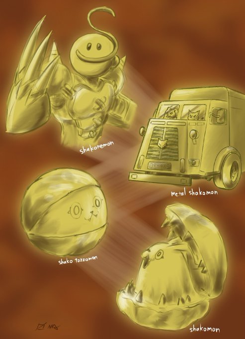 シャコモンの ワープ進化を描きました。 #Digimon #デジモン絵 #シャコモン #シャコトッツォモン #メタルシャコモン #シャコネモン #shakomon #shakotozzomon #metalshakomon #shakonemon #しゃこねコーヒー