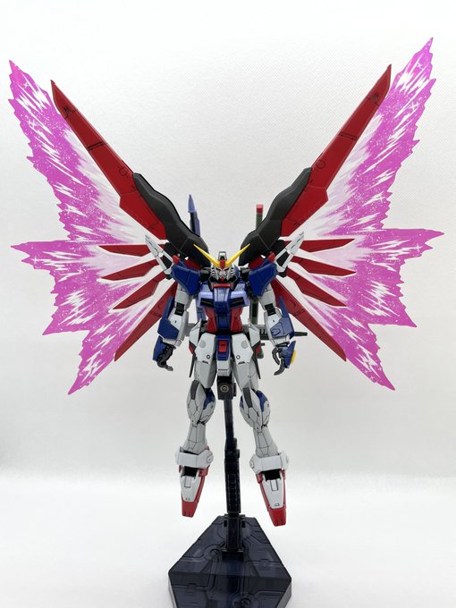#ガンプラ #デスティニーガンダム 完成しました! エアブラシで塗装して、トップコート(半光沢)まで仕上げたのはこれが初めて。 スジ彫り頑張ったつもりでも彫りがあまく、綺麗に入らなかったりでまだまだ理想には遠いですが頑張って作っていきます!