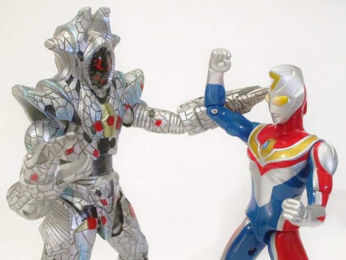 おはよウルトラマンダイナ! 当時のサウンドアクションフィギュア(?)が存外良い身長差。 真骨彫が来るまではこの人で遊びます。 さあ、本日の戦いはここからだぜ👍✨ #オモ写 #toyphotography #デスフェイサー #ウルトラフィギュア改造同好会