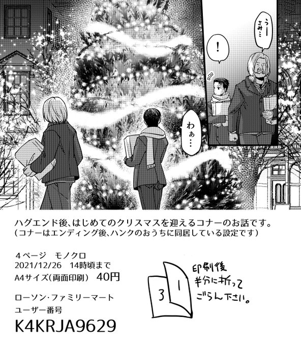 #デトロイトクリスマスカード交換会2021 クリスマスカードと異なりますが良ければ参加させてください…! A4用紙に白黒印刷の4ページ漫画となります。 漫画はクリスマス頃に公開予定です。 ローソン・ファミマ K4KRJA9629