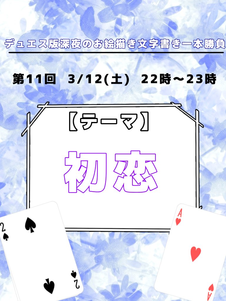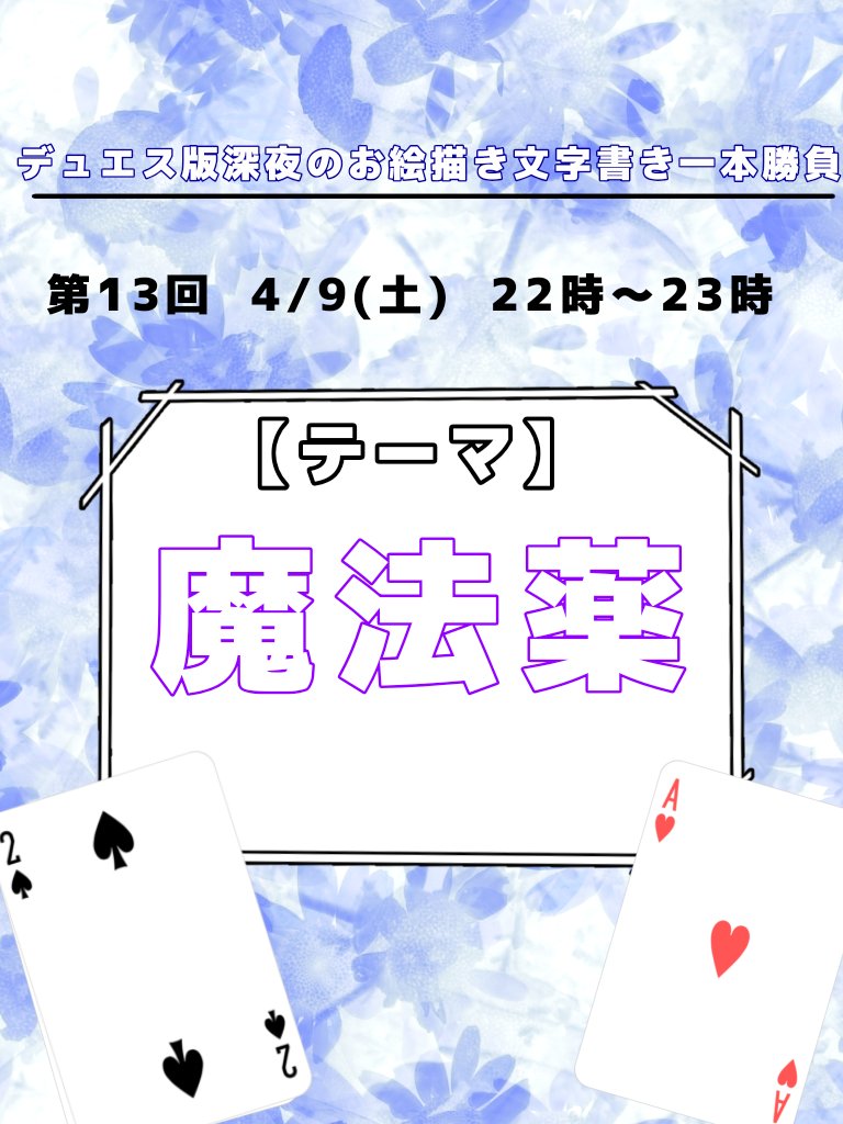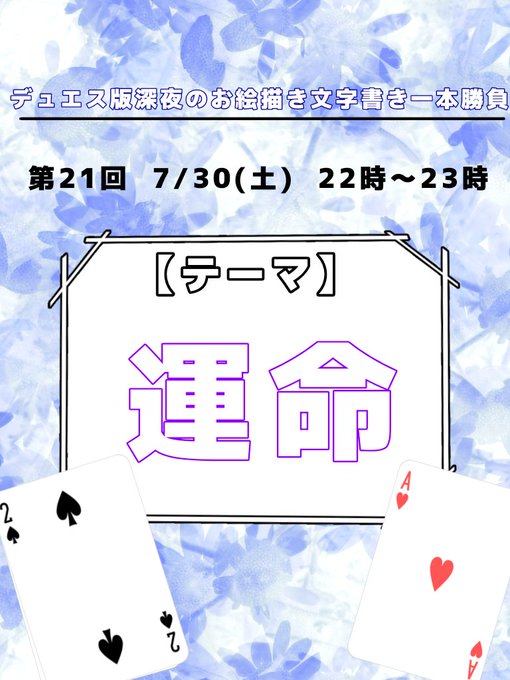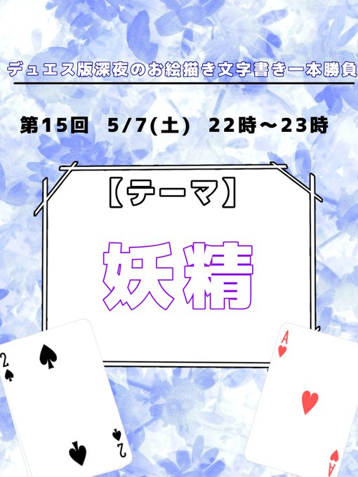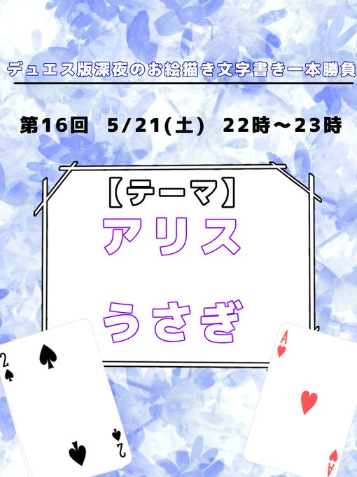 第16回のお題は『アリス』と『うさぎ』です。(お題はどちらか片方でもOKです) 5月21日の開催となります。 bio記載のタグをつけて投稿してください。 たくさんの方のご参加お待ちしております! #デュエスワンドロワンライ