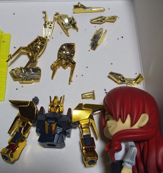 「今夜も #デルタガンダム の組み立ての続きをやるか…。Gメッキパーツのゲート跡をGマーカーで全部塗り潰したぞ!🙄今夜もブリリアントな夜を!👍金色のデルタ〇ガ来てくれ…!😬」 #ガンプラ #ガンプラの画像貼るとRTされると聞いて