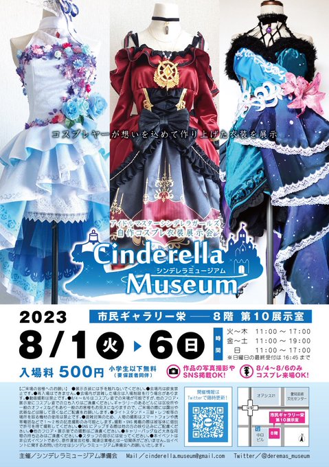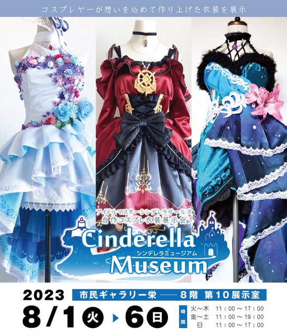 8月1日(火)〜6日(日)名古屋市民ギャラリー栄 【コスプレ衣装展シンデレラミュージアム】 火〜木曜日の開催時間が11時〜16時➡️11時〜17時に変更になりました! 平日はゆっくりご覧いただけますので是非お越しください♪ 衣装展示の応募は5/30まで!お申込はこちら docs.google.com/forms/d/1sVoOa… #デレアム