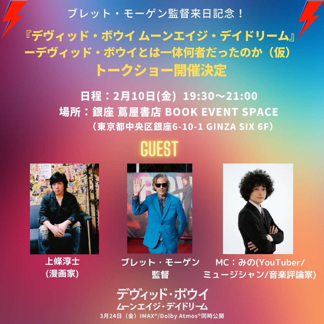 『デヴィッド・ボウイ ムーンエイジ・デイドリーム』 #デヴィッド・ボウイ #ムーンエイジ・デイドリーム 2月10日(金曜日) 19時30〜 銀座蔦屋書店 ブレット・モーゲン監督をお招きしてお話を伺います MCは みのさんです オンラインのお申し込みは本日 12時までです! eventmanager-plus.jp/get/496f86a273…