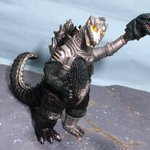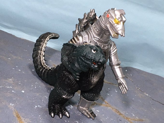#夜のフィギュア撮影会 お題『元気』 ニセゴジラが炎に包まれたと思ったら・・まだ元気!?メカゴジラの登場だ!(←ソフビ改造で『トイグラフ メカゴジラ 50%』っぽいフィギュアを作ってみた) #メカゴジラ #ゴジラ #MechaGodzilla #Godzilla #トイグラフ 風 #ソフビ #ゴジラVSメカゴジラ #オモ写