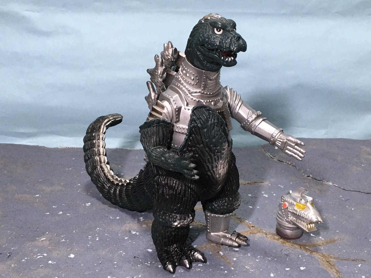 #夜のフィギュア撮影会 お題『フリー』 皮剥げメカゴジラ!ソフビはどんな自由な発想で作ってもいいんだ!?←『トイグラフ メカゴジラ 50%』風の改造ソフビ! #メカゴジラ #ゴジラ #MechaGodzilla #Godzilla #トイグラフ 風 #ソフビ #ゴジラVSメカゴジラ #オモ写