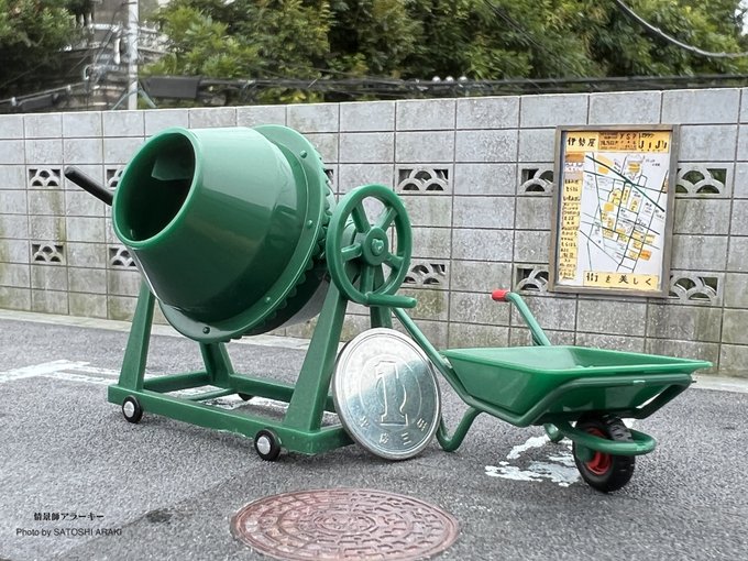 【I love カプセルトイ】 『1/24 コンクリートミキサー』 ミキサーはハンドル操作で回転! 内部の掻き混ぜ用の羽根の造形まで抜かりなく、猫車や角シャベルはジオラマのアクセントに最適! まとめ必然品♬ amzn.to/3nC152r (写真は合成ではなく同scaleのジオラマで撮影) #トイズキャビン