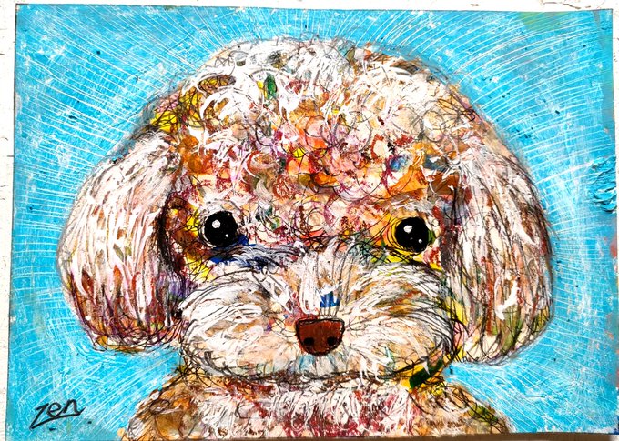 トイプードルのリーフちゃんの似顔絵を描かせて頂きました♡ いつもこんな風に、ママさんを見上げてくれてるそうです♡素敵なご縁をありがとうございました♡ #みんなで楽しむTwitter展覧会 #イラスト好きさんと繋がりたい #色鉛筆画 #犬の似顔絵 #トイプードル