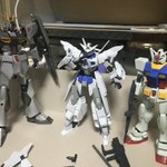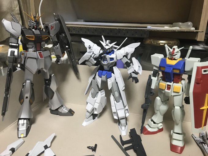 #トライエイジマグナム のガルグレーで塗ったところがなんか色が濃い感じしたのでライトグレーを重ねて吹きました。 今日はここまで…。 なんとなく並べて見たんだけどEGνガンダムでかいな。 #ガンプラの画像貼るとRTされると聞いて