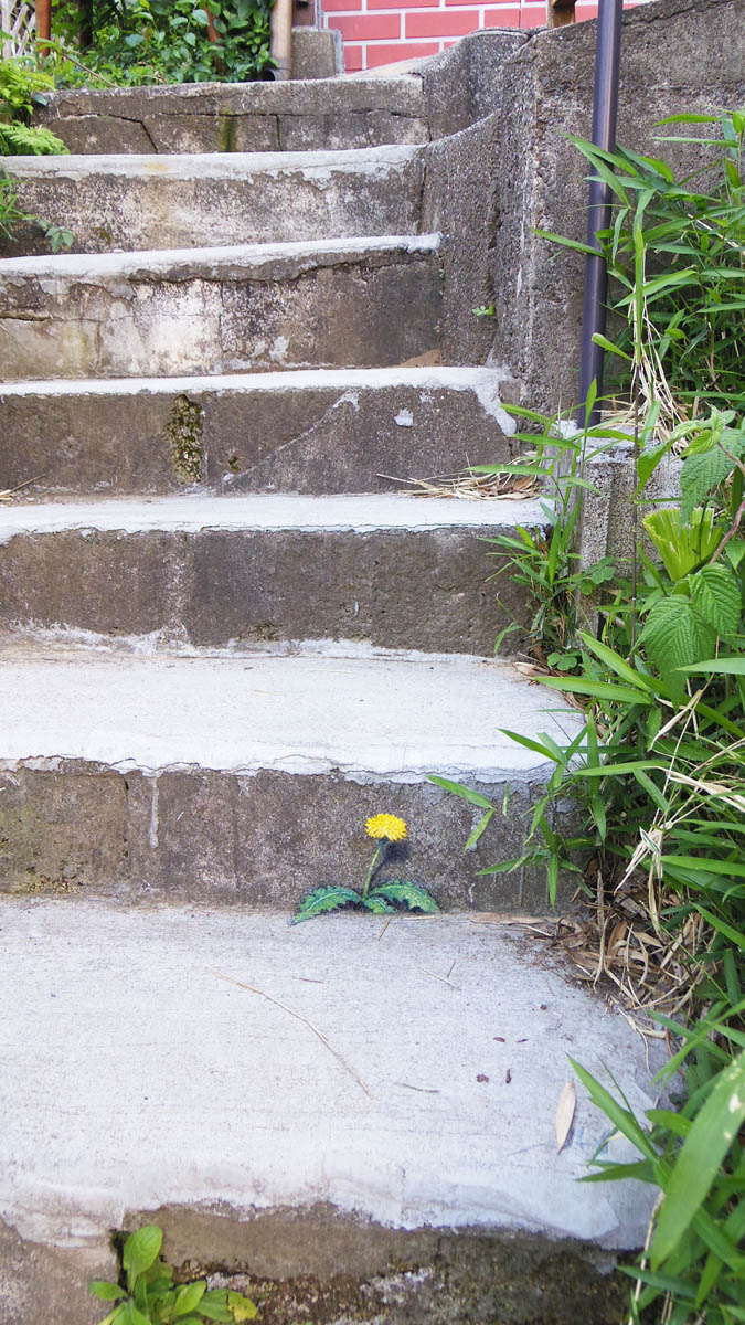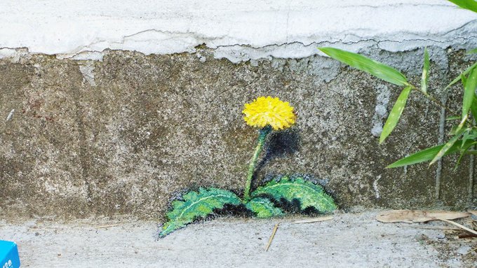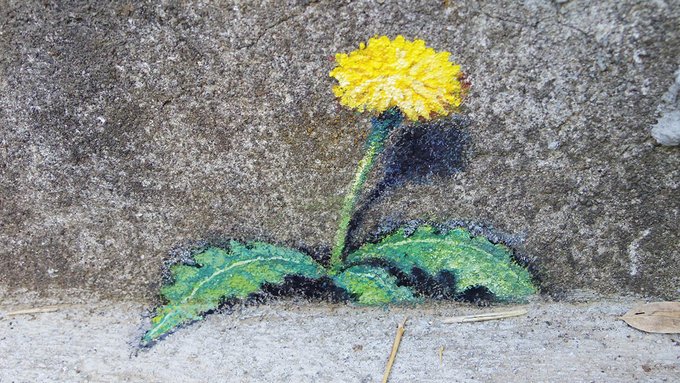 TIDA's houseさんの階段に描いたトリックアートのたんぽぽ、制作後3週間で特に剥離も見られないので耐久性は問題なさそうです🖌😊🎨 一段下の天然の花とコラボしてます🌼 上が絵で下が本物です✨ #トリックアート #だまし絵 #壁画 #アナログ絵 #絵描きさんと繫がりたい #イラスト好きな人と繋がりたい