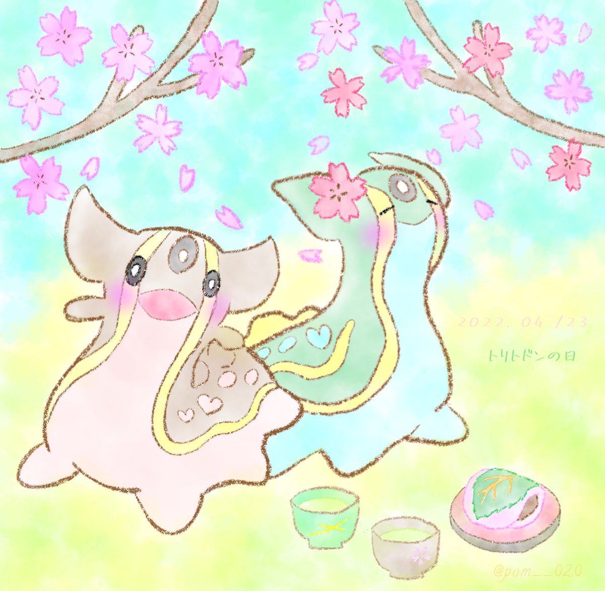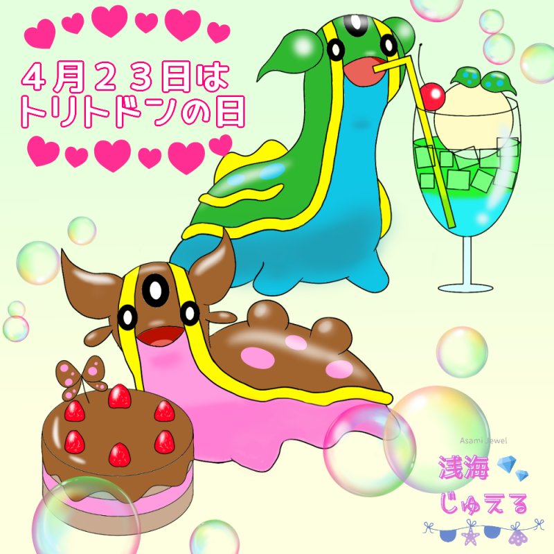 愛しのトドンちゃん達おめでとう🎉 いつも癒してくれるお礼に、2人をイメージしたスイーツをプレゼントするよ🎁✨ 💚💙これからも、全力で推していきます🤎💗 よろしくぽわぁね!! #トリトドンの日 #4月23日はトリトドンの日 #ポケモンイラスト