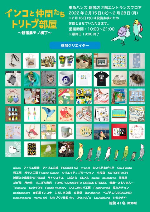 イベントの告知です🤗 2月15日(火)~28日(月)まで、東急ハンズ新宿店2階エントランスフロアで「トリトブ部屋」開催です。 UnitNA'sのグッズ(委託)販売いたします。 ★16日休館 よろしくお願いいたします。 #トリトブ部屋 #イラストレーター渚 #インコ