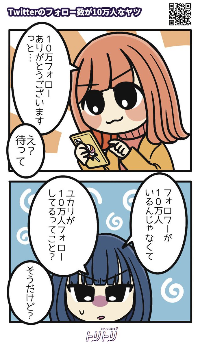 Twitterのフォロー数が10万人なヤツ【アニメ】 youtube.com/watch?v=3OoiQV… 動画の2コマ漫画です。みんな何人くらいフォローしてるんですかね。 本編の方も是非🍭 クレジットはリプに記載👻 #漫画が読めるハッシュタグ #漫画 #2コマ #トリトリ #トリトリエ
