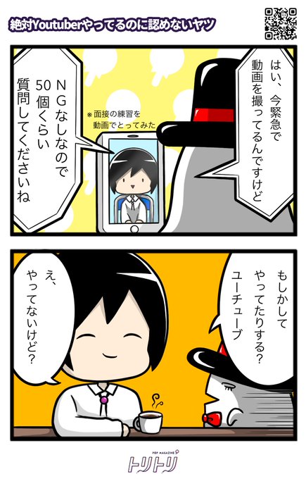 【アニメ】絶対Youtuberやってるのに認めないヤツ youtube.com/watch?v=MU9zHN… 今緊急で動画の2コマ漫画をツイートしています クレジットはリプに👻 #漫画が読めるハッシュタグ #漫画 #2コマ #トリトリ #トリトリエ