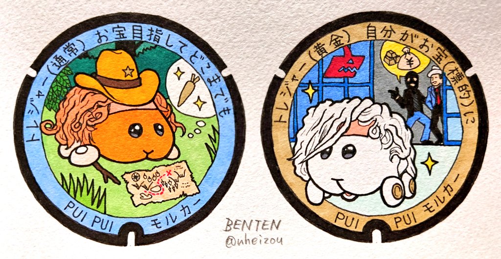 チョコ「トレモルは私が守るプイ❗️」 トレモル「(キュン……❤️)」 (イメージ) ※画像は再投稿 #モルカーファンアート #チョコ #トレジャーモルカー #黄金モルカー #イラスト #色鉛筆画 #モルカー8話ここ好き