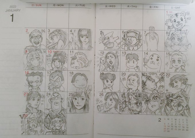 落書きカレンダー 1月完成🐯 下旬あたりから気合い入れすぎたかも、、 2月はもう少し手を抜いてみます(^_^;) #今月描いた絵を晒そう #落書き好きな人と繋がりたい #イラスト好きと繋がりたい #少年アシベ #トロピカル~ジュプリキュア #ラムちゃん #トンボ学生服 #乃木坂46 #我妻善逸