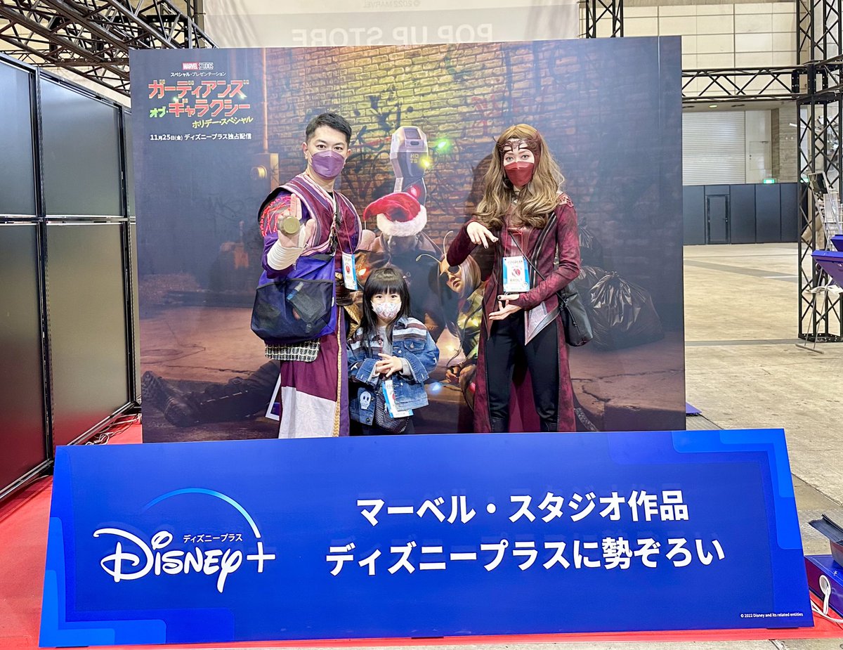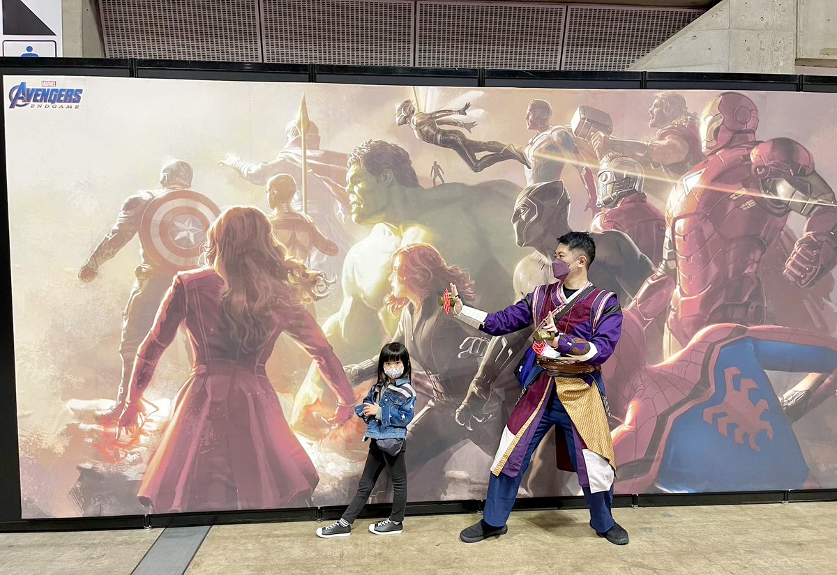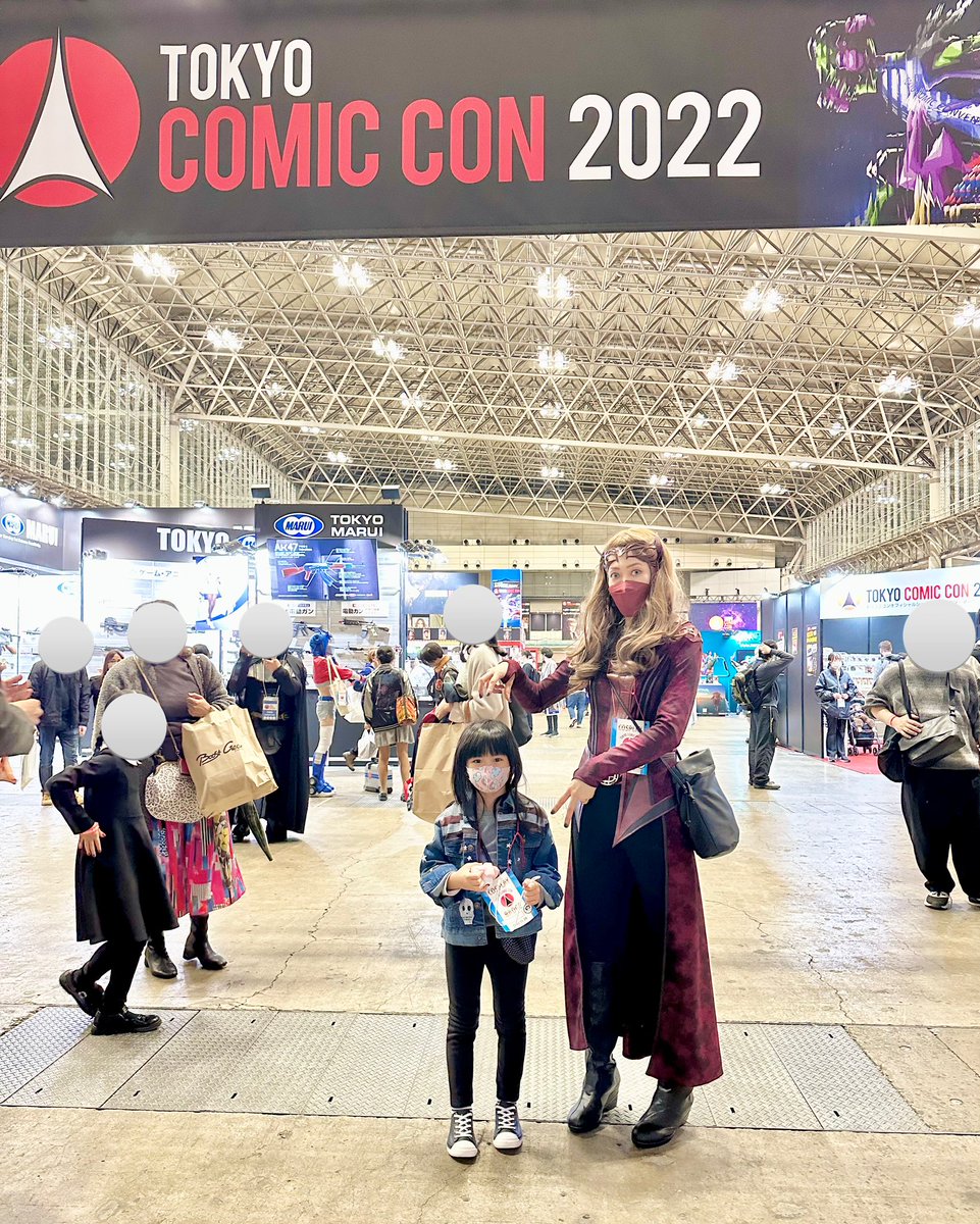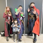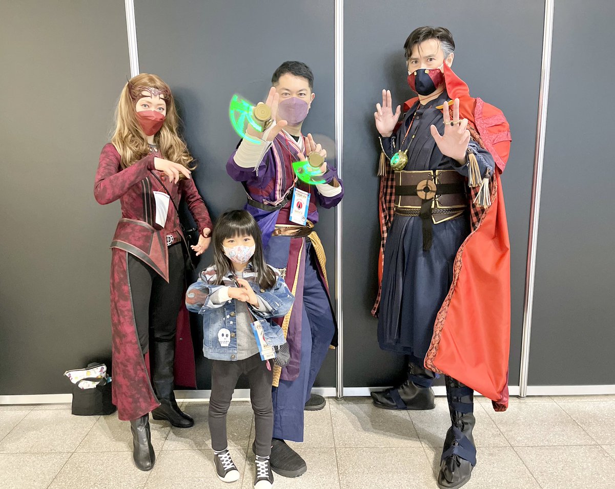 ミニアメリカチャベス、ワカンダフォーエバーを気に入ってしまいやたらにそのポーズをしようとするので、キャラが違うと注意したり😅 今回3人で撮ってもらった写真が少なく、貴重な1枚になりました👨👩👧📸 #東京コミコン #東京コミコン2022 #東京コミコンコスプレ #ドクターストレンジMoM