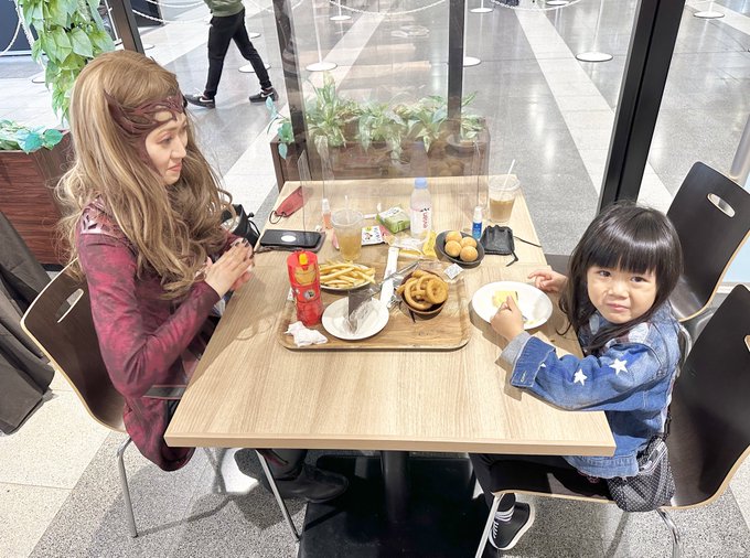 ミニアメリカチャベスはMCU大集合のコスプレギャザリングに参加した後、お腹空いたー!と騒ぎまくり近くのカフェで休憩😨 分かりやすくご機嫌になりました👧🏻🇺🇸(笑) #東京コミコン #東京コミコン2022 #東京コミコンコスプレ #ドクターストレンジMoM