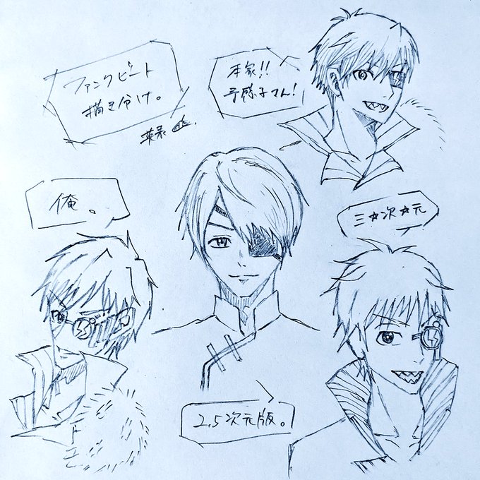 大天才の描き分け。 2.5次元版の描き方確立したいな…もうちょっと似せに行きたい………にしても手癖くんの異質感すご…一緒に並べるっていいな、すごく勉強になる。 #ドクターファンクビート #ファンクアート先生