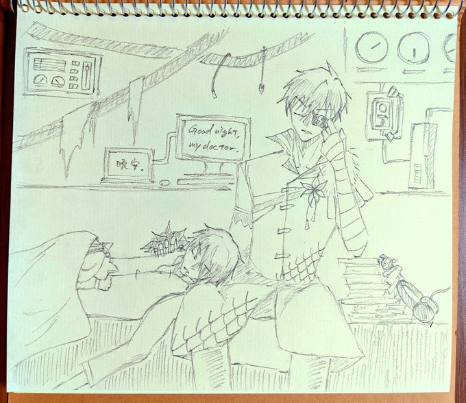 3次元の大天才が2.5次元の見舞いに来た図。健康第一、ジーニャスも伴にうとうと💤ゆっくり休んでくださいね、ドクター。 …部屋とシャオロン繋がってるし次元超えてちゃってるけどまぁ…まぁその辺は大天才なので…。笑 #ドクターファンクビート #ファンクアート先生