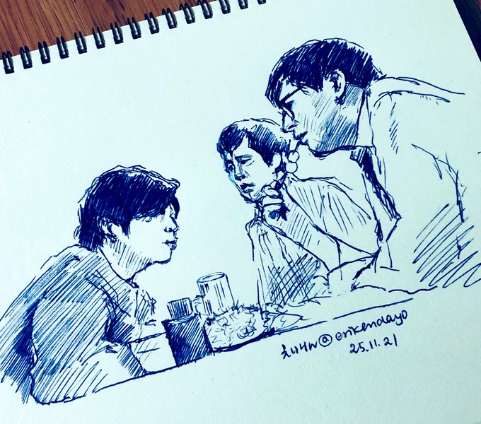 #ドクターX #ボールペンスケッチ 全シーン良かった神回だったけれど、ここの居酒屋シーンの3人が最高だった( ¤̴̶̷̤́ ‧̫̮ ¤̴̶̷̤̀ )💗…と思わず噛み締めて落書き。加地先生似てなくてごめんなさい🙇🏻♀️💦でも原守先生はよく描けた気がするの…つくね美味しそうだったね。居酒屋行きたい🏮