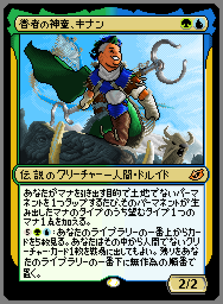 イコリアより「眷者の神童、キナン」の完成です!! キナンの持つ武器や、足元の動物たちのグラデーションが楽しく達成感あふれる仕上がりになりました!! 沢山の人に見てもらいたいので、拡散よろしくお願いしまーす!!ヽ(´θ`*)ノ #ドットEDH #pixelart #mtgfanart