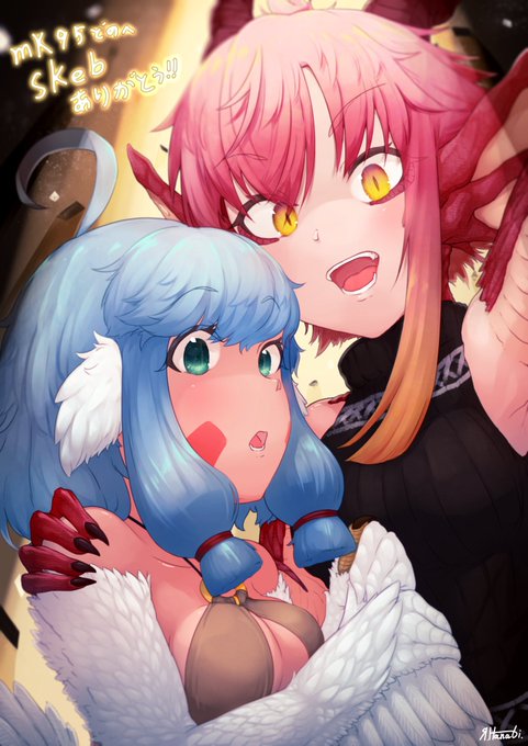 19 44 mk95どのからのskeb『ハナビ殿と青髪ハーピィちゃんのコラボが見てみたいです』を描かせて頂きました。 skeb感謝!!!!!!!!!!!!! #ドラゴナート 21/09/09 19:55