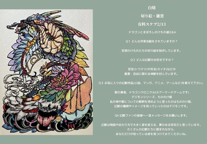第26回ジオアートワークス企画公募展 🐉#ドラゴンとまぼろしのけもの達展7🦄 大阪中津くまのみギャラリー2/11-13 13-19時最終日17時まで 〈作家15名様ご紹介Q&AをHPに掲載〉 作家様ご紹介 白烙さん@bkrk_rtrt 🐉有料スケブ2/13 #切り絵 #雑貨 #ドラゴン #幻獣 #公募展 hookjawgeoartworks.jimdosite.com/geoatrworksdra…