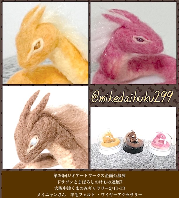 第26回ジオアートワークス企画公募展 🐉#ドラゴンとまぼろしのけもの達展7🦄 大阪中津くまのみギャラリー2/11-13 13-19時最終日17時まで 〈作家15名様ご紹介Q&AをHPに掲載〉 作家様ご紹介 メイニャンさん@mikedaihuku299 #羊毛フェルト #ワイヤーアクセサリー #ドラゴン #幻獣 hookjawgeoartworks.jimdosite.com/geoatrworksdra…
