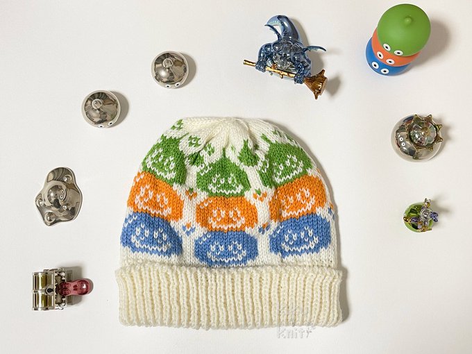 ドラゴンクエスト36周年おめでとうございます!🎊 今年はスライムタワーニット帽、 (ファミコン版のスライムドット絵から応用の図案…) 思い立って作りました。 過去に作ったドラクエなニット帽たちも出してきて(被ってだいぶボロボロのもあるけど)久々に撮影。 #ドラクエの日 #ドラゴンクエストの日
