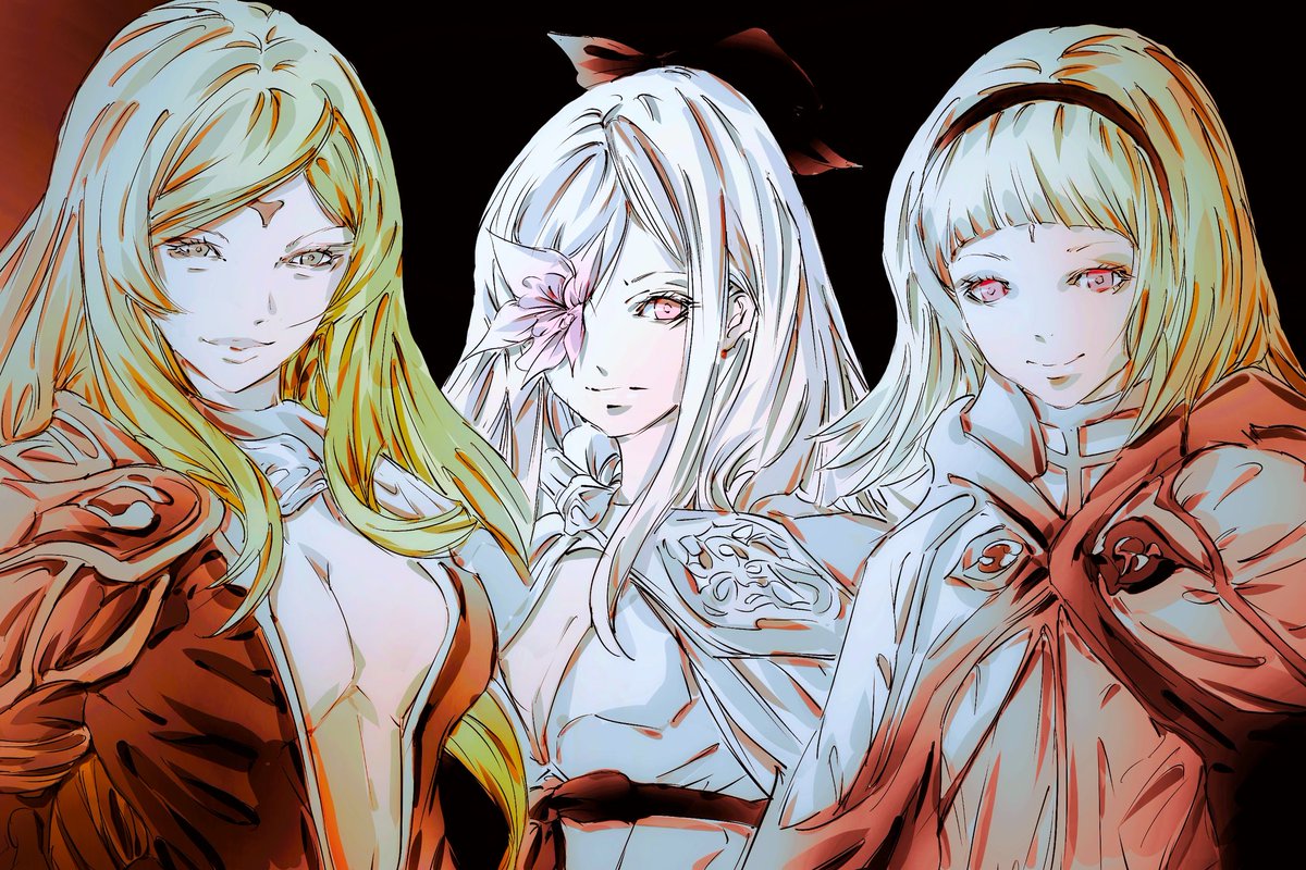 退廃的なイメージのもと、 明暗コントラストを普段以上に意識して彩飾してみました🎨 真ん中女子(ZERO姉さん)のリボンに ダークファンタジー要素を集約できたと感じています #ドラッグオンドラグーン3 #イラスト #デジタルイラスト #イラスト好きな人と繋がりたい #絵描きさんと繋がりたい