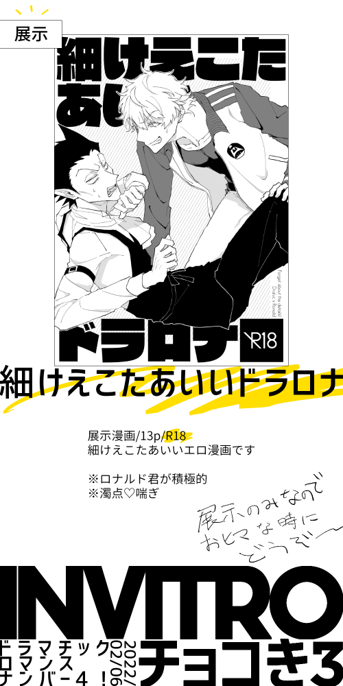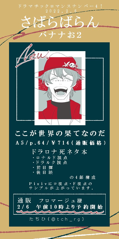 #ドラロナwebオンリー0206 スペース【🍌お2】 新刊はドラロナ死ネタ本です。 □視点・ト”視点・前日譚・後日談の4部構成。 新刊はフロマージュ様にてイベント後に取り扱っていただく予定です。 当日はΔで展示出せたらな…と思っております。 よろしくお願いします! ↓新刊サンプルはツリーにて