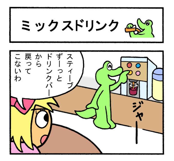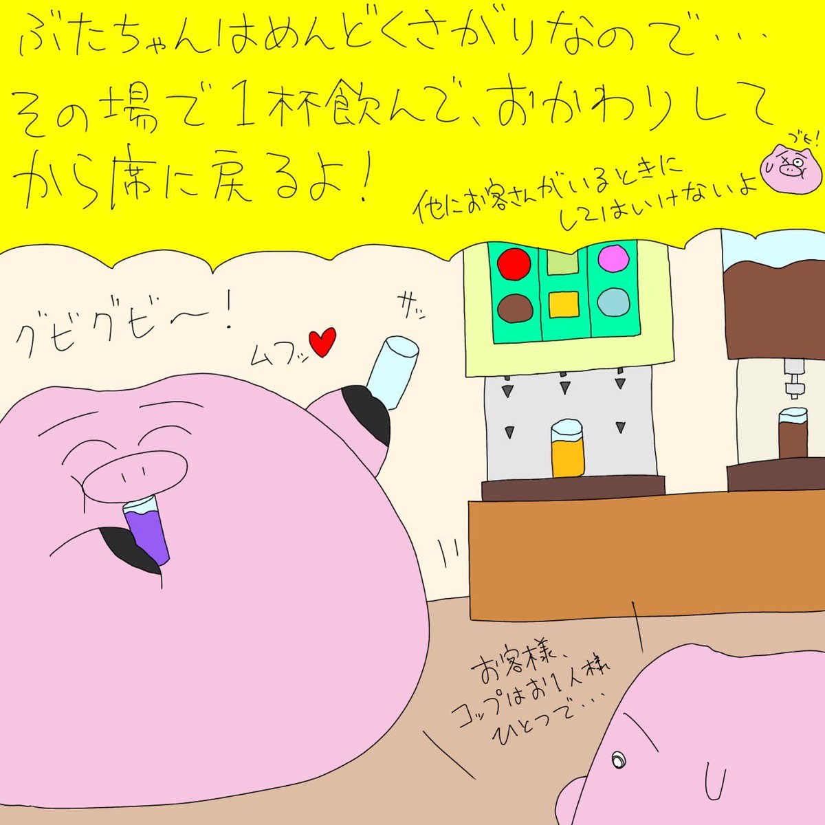 ぶたちゃんはブヨなので、ドリンクバー🍹ではその場で飲んでからおかわりして席に戻っていくよ🐽💦 まったく、めんどくさがりなんだから‼️ #illustration #絵描きさんと繋がりたい #イラスト好きな人と繋がりたい #ドリンクバー #ばかぶたちゃん